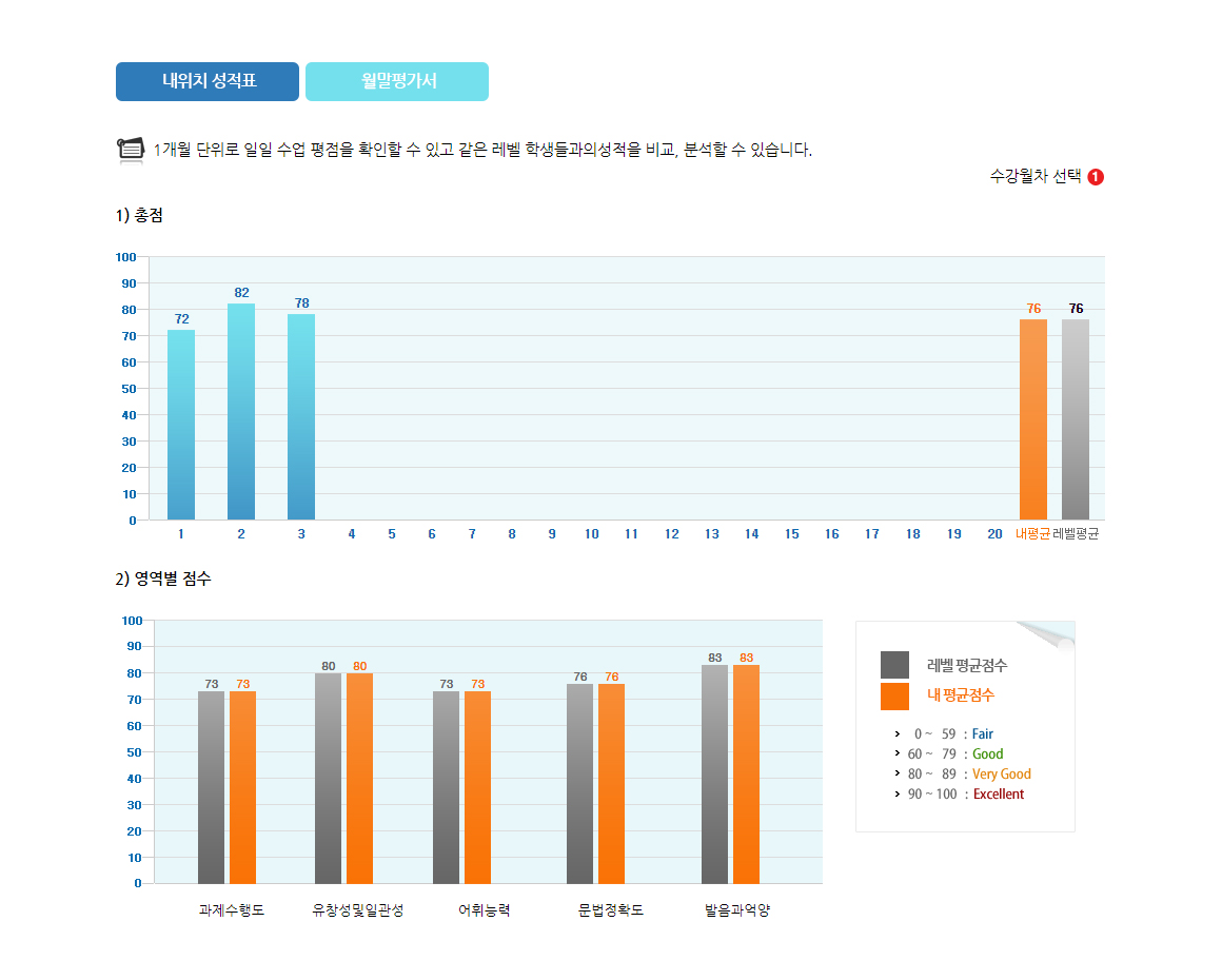 일일수업 평점과 평균값을 기준으로 같은 레벨 학생들과의 수업성취도를 비교, 평가 할 수 있습니다.